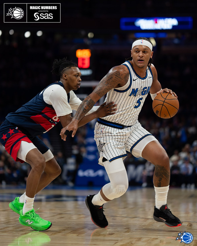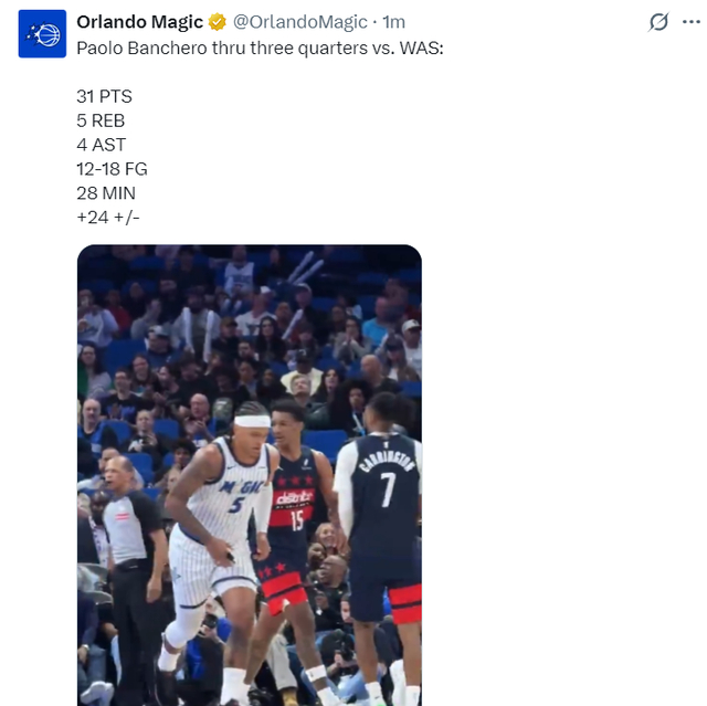 魔术核心保罗-班凯罗最大的问题就是稳定性不足,但面对奇才这种摆烂的球队他必然重拳出击,首节班凯罗8分钟里8中5+三分2中1+罚球2中2拿到13分2篮板1助攻,上半场打完他已经拿到18分。
