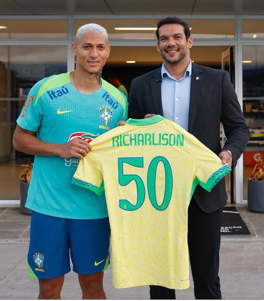 北京时间9月3日,巴西足协向里沙利松送上为国家队出战50场比赛纪念球衣。随后,里沙利松更新了社交媒体动态,晒图纪念自己的国家队里程碑。